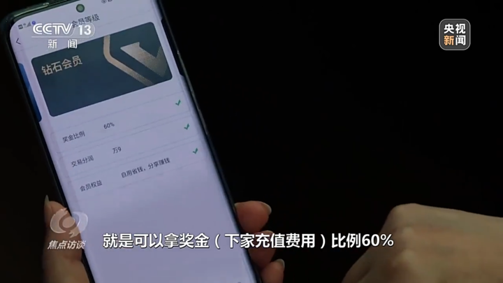 网联嘉网络传销平台参与者 周女士:钻石会员如果平推会员可以拿奖金,奖金(下家充值费用)比例是60%。